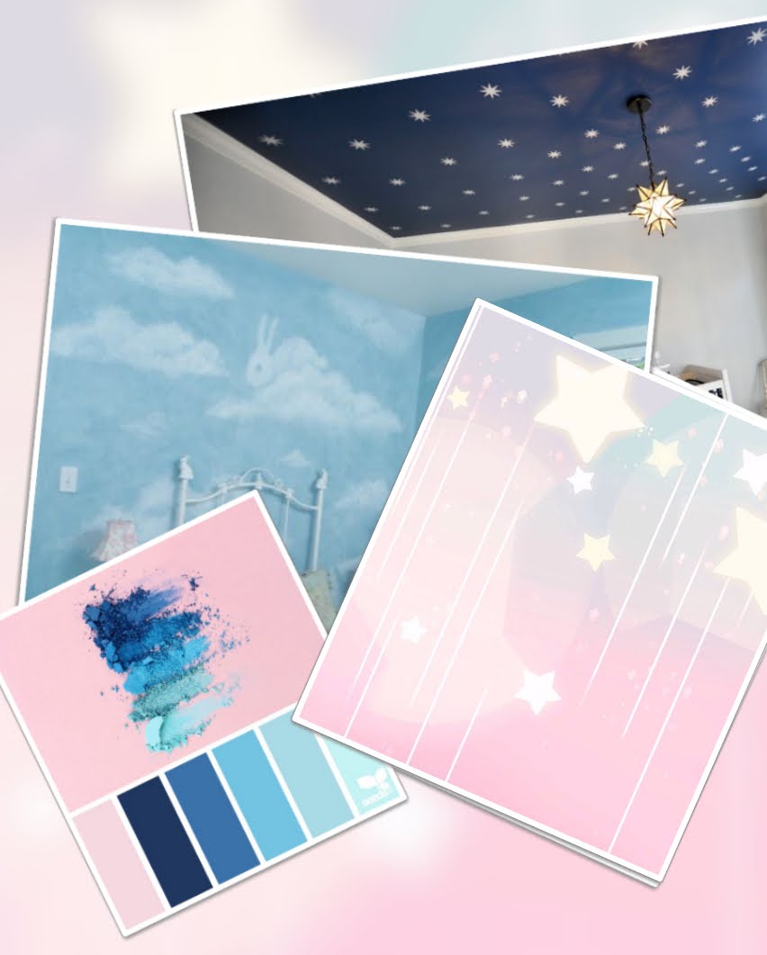 The walls would go from pink close to the floor through sax on the walls and navy on the ceiling. The floor would be cotton candy pink and the navy ceiling would have lights shaped like Moon and planets, with little spot lights in between to symbolize stars.